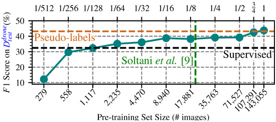 Scaling Data Matters—As part of our experiments, we explored the neural scaling law [43] to evaluate how varying the amount of data in impacts the performance of the pre-training stage (PT) of . As can be seen from Figure 14, the amount of pseudo-labeled pre-training data has a significant impact. The fact that this curve does not exhibit a plateau indicates that collecting more UAV images, which can then be automatically pseudo-labeled, would improve the performance. For reference, we marked the equivalent amount (on a pixel-count basis) of pre-training data available in Soltani et al. [9] with a vertical green dashed line. As can be seen, our study goes almost one order of magnitude farther.