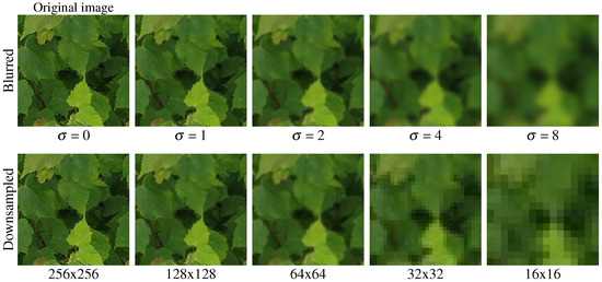 Gaussian filtering applied to a 256 × 256 patch from the dataset. The first row shows Gaussian blur applied with at each level of the Gaussian pyramid, where k represents the pyramid level. The second row illustrates Gaussian blur followed by downsampling by a factor of at each level.