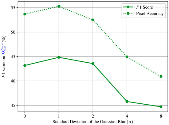Impact of Ground Sampling Distance (GSD)—Based on our gathered insights from related works, we quickly identified GSD as one of the key parameters to producing more accurate pseudo-labels. Consequently, we selected a very low UAV flight altitude, at 3–5 m above the plants, for our data acquisition sorties. This way, our large unlabeled dataset would contain images capturing many fine vegetation details, especially leaf shape. Our original GSD, ranging from to , also allows us to test this theory, by artificially increasing an image’s GSD via Gaussian blurring. For this test, we were inspired by the Gaussian pyramid approach [44], in which the scaled-down image at level k is obtained by convolving the original image with a Gaussian function. The standard deviation () of the Gaussian function is set to for level k. The increase in the GSD is determined by the downsampling factor. Consequently, convolving the image with a Gaussian function having ensures that the GSD is proportionally scaled down by a factor of . We performed this for a factor of 2 over four iterations, resulting in GSD approximate averages of , , , and , as seen in Figure 15, considering a base average GSD of .