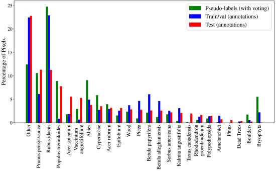 Species Distribution—Figure 17 illustrates the distribution of species in the pseudo-labels , as well as across the and datasets. One can see the strong class imbalance present in our problem. While the species distributions in these datasets are not identical, they reflect important differences that can be attributed to the distinct geographic locations where the data were collected. As shown in Figure 4, the annotated data for the training and validation sets were gathered from different locations than the test set, to evaluate the model’s robustness under varying environmental conditions. In addition, it is important to have a test set in which each species is represented with a distribution close to what we see in regeneration forests. The importance is less on the train and validation datasets as a difference in distribution can show the models’ generalization capabilities and avoid over-fitting. Another possible source of label imbalance comes from the fact that our pseudo-labels were generated using the image classifier. This classifier was trained on an imbalanced dataset (iNaturalist), which thus may have introduced biases in the pseudo-labeling generation process, potentially affecting the distribution of species in the resulting labels. For example, Bryophyta (Mosses) was one of the difficult classes to find during UAV data collection since it forms a low-growing, surface-covering layer, often hidden beneath dense vegetation. However, it was one of the most dominant classes in the training data from iNaturalist. This difference is reflected in the pixel percentage of Bryophyta (Mosses) in the pseudo-labels and the test dataset , as seen in Figure 17. While there may indeed be more Bryophyta (Mosses) in the unlabeled images , the observed increase is likely inflated due to biases in our classifier.