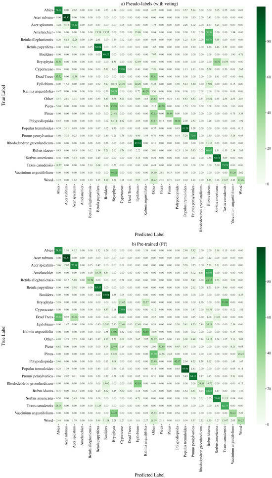 Confusion matrices for (a) pseudo-label generation using the moving-window approach with the voting strategy, and (b) pre-training (PT) on the generated pseudo-labels using Mask2Former.