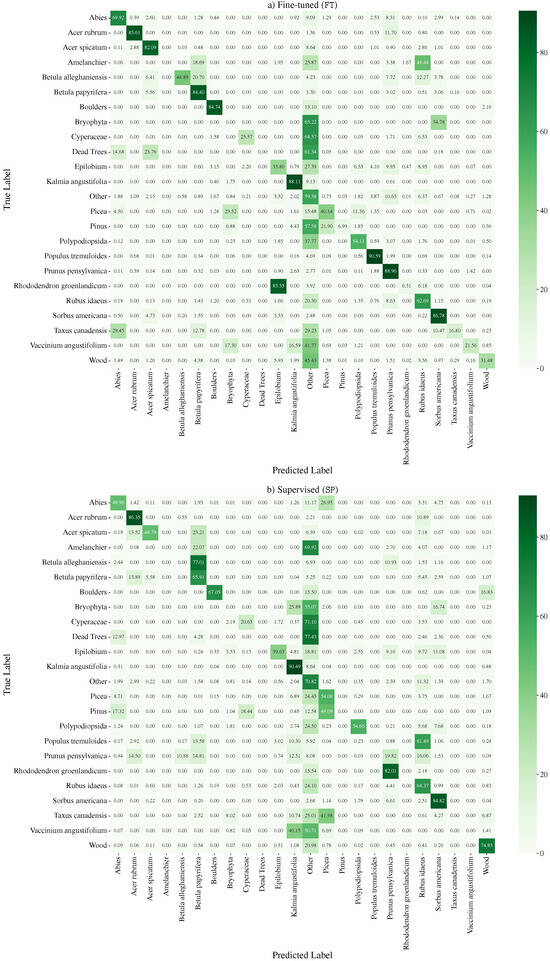 Confusion matrices for (a) our fine-tuning approach (FT) applied to the pre-trained weights from the PT stage using 71 annotated images with Mask2Former, and (b) the supervised approach (SP) using 71 annotated images with Mask2Former.