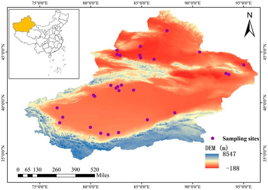 The study area was located in Xinjiang, Northwestern China (36°86′–47°10′ N, 76°70′–95°01′ E), and the altitudes ranged from 235 m to 1411 m (Figure 1). The annual mean temperature there varies between 6.2 °C and 13.5 °C, while the annual mean precipitation ranges from 27.2 to 192.4 mm. This region exemplifies an extreme desert ecosystem, with an aridity index of 0.09 (an aridity index of <0.2 classifies it as an arid region; the aridity index is defined as the ratio of annual total precipitation to potential evapotranspiration) [28]. The main woody plant species in the study area include Populus euphratica, Elaeagnus angustifolia L., Tamarix ramosissima Ledeb., Juglans regia L. and Lycium barbarum L. Populus euphratica, as a representative woody plant, is widely distributed in Xinjiang. The main growing season is between June and July, and the leaf-fall period occurs from October to November. The study area characteristics are detailed in Appendix A (Table A1).