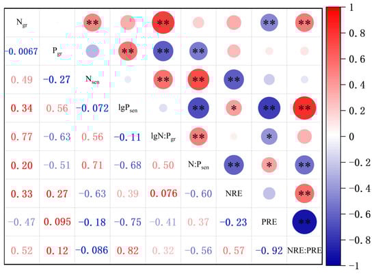 Correlation between leaf nutrient resorption and nutrient content. “*” represents a p value that is significant at the 0.05 level, and “**” represents a p value that is significant at the 0.01 level. Ngr and Pgr, respectively, represent nitrogen and phosphorus concentrations in green leaves; Nsen and Psen, respectively, represent nitrogen and phosphorus concentrations in senescent leaves; N:Pgr and N:Psen, respectively, denote the ratios of nitrogen to phosphorus concentrations in green leaves and senescent leaves; NRE and PRE, respectively, represent nitrogen and phosphorus resorption efficiency; and NRE:PRE denotes the ratio of nitrogen to phosphorus resorption efficiency.