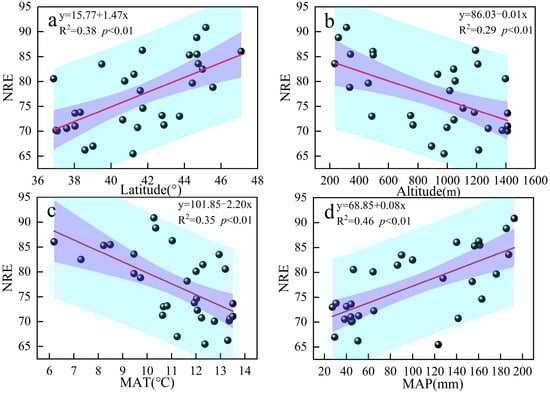 Relationships between nitrogen resorption efficiency and latitude (a), altitude (b), mean annual temperature (c) and mean annual precipitation (d). NRE represents nitrogen resorption efficiency; MAT and MAP represent mean annual temperature and precipitation.
