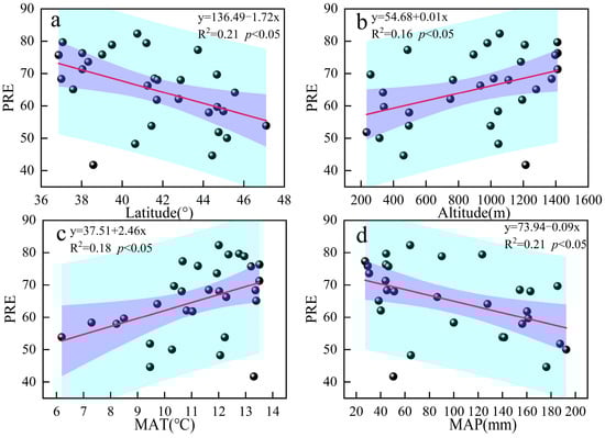 Relationships between phosphorus resorption efficiency and latitude (a), altitude (b), mean annual temperature (c) and mean annual precipitation (d). PRE represents phosphorus resorption efficiency; MAT and MAP represent mean annual temperature and precipitation.