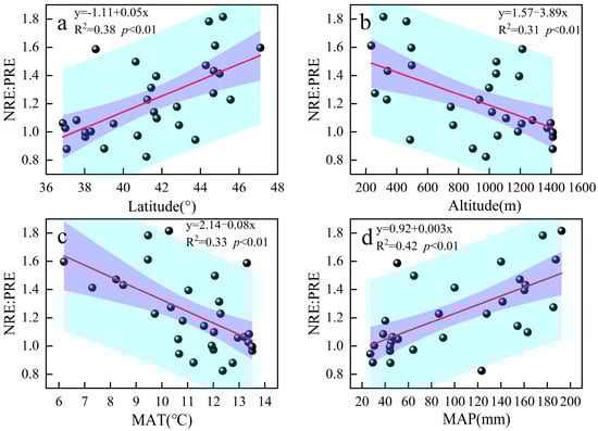 Relationships between the ratio of nitrogen and phosphorus resorption efficiency and latitude (a), altitude (b), mean annual temperature (c) and mean annual precipitation (d). NRE:PRE denotes the ratio of nitrogen to phosphorus resorption efficiency; MAT and MAP represent mean annual temperature and precipitation.