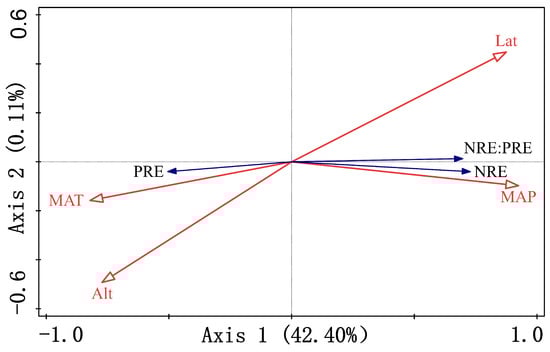 Redundancy analysis plotting of nutrient resorption and environmental factors. NRE and PRE, respectively, represent nitrogen and phosphorus resorption efficiency; NRE:PRE denotes the ratio of nitrogen to phosphorus resorption efficiency. Lat, Alt, MAT and MAP represent latitude, altitude, mean annual temperature and mean annual precipitation, respectively.