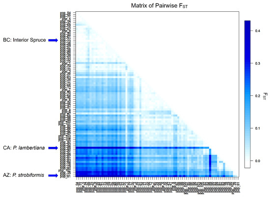 Locus-specific FST values were all significant and ranged from 0.040 to 0.219 (Table 2). This evidence of range-wide genetic structure is also noted in the overall FST value of 0.0683 (p < 0.001) among all 82 sampling locations. Pairwise population FST values range from nonsignificant to a maximum of 0.431 between sites in AZ and northern AB (Figure 1). Specimens collected from sugar pine (Pinus lambertiana Dougl.) were also noted for their pairwise divergence (FST 0.404–0.168) from all other sites. Beetles from a successful brood noted in interior hybrid spruce (Picea glauca × engelmannii) were not significantly different from adjacent lodgepole pine sites in northern BC.