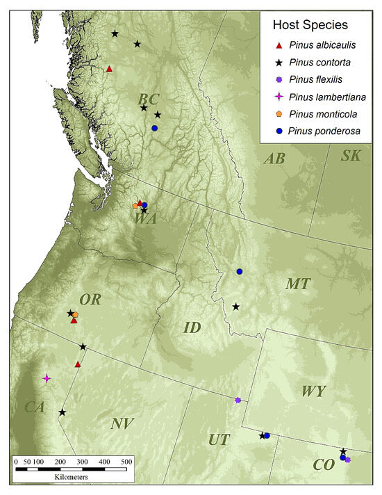 Influence of host species on the genetics of Dendroctonus has been investigated since the early work on the genus. Initial studies used allozymes to compare the genetic signatures of many species of bark beetles in North America. While variation was detected, many of these studies compared beetles sampled from multiple host tree species from different locations, thus conflating the effect of geography and host tree species (summarized in ref. [29]). A study that sampled declining MPB populations on sites containing two host species found that geographic location was likely a stronger influence than host tree [29]. In contrast, another study compared hosts in geographically proximal sites in Colorado and found that the effect of host was equal to that of location [30], concluding that host effects may increase genetic heterogeneity and lead to the development of pre-adapted sub-species, or host races, of MPBs. More recent studies using amplified fragment length polymorphism (AFLP) markers of the MPB from eight sites in the United States and Canada expanded host species comparisons and added a landscape genetic structure component, finding a general pattern of isolation-by-distance with little host effect [21]. However, specimens from host tree species in divergent sites were combined, which may have obscured the influence of the host. Other studies assessed the landscape genetic structure of MPBs using microsatellites [31] and single nucleotide polymorphisms (SNPs) [32,33], finding two clusters of genetic similarity divided into north and south populations. However, the host tree was excluded from these analyses, and only Batista et al. [33] included sites from the United States.