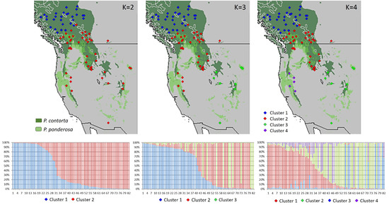 STRUCTURE analysis of 82 sites in western North America. K = 2 is most strongly supported with weaker sub-clustering, K = 4, in the southern sampling locations. Distribution ranges for Pinus contorta and P. ponderosa are also shown. Note, to maximize contrast, different color coding in the cluster graphs was used for K = 4.