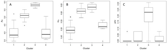 (A) Allelic richness (AR), (B) observed heterozygosity (HO), and (C) private alleles (priv) grouped by STRUCTURE-generated cluster: (1) northern: northern: BC/Alberta; (2) central:southern: BC/Alberta/Washington/Idaho/Montana; (3) southwestern: Oregon/California/Nevada and; (4) southeastern: Utah/Wyoming/Arizona/Colorado/South Dakota. The boxplots incorporate Tukey’s 5-number summary as follows: the sample minimum, defined by the horizontal line at the bottom of each plot; the lower quartile, defined by the lower limit of the box in each figure; the sample median, represented by the heavy line inside each box; the upper quartile, defining the upper limit of each box; and the sample maximum, defining the horizontal line at the top of each plot. Open circles represent potential outliers falling outside the interquartile range.