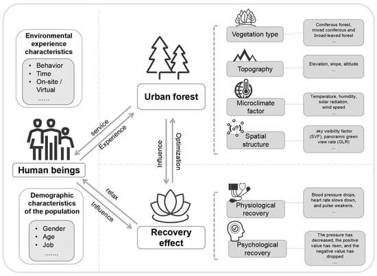 Conceptual framework diagram of the restoration mechanism based on human, urban forest and restoration effect.