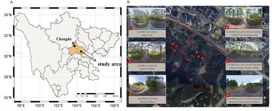 Chengdu, as a major metropolitan city in Southwest China, currently encompasses an urban forest area of 570,000 hectares, with a forest coverage rate exceeding 40%; coniferous forests and coniferous–broadleaf mixed forests are widely distributed and structurally stable in Chengdu, making them representative of the common characteristics of urban forests in southwestern China. The two forest stand plots are located in close proximity, with typical microclimatic and vegetation characteristics. The experimental plots were selected according to following criteria: (1) the forest plot area should be no smaller than 1hectares [37]; (2) the plot should contain a relatively natural plant community [38]; (3) and the plot should possess a clear forest edge [39]. Ultimately, two types of urban forests (evergreen coniferous and evergreen coniferous–broadleaf mixed forests) were selected in Yong’an Lake Urban Forest Park in Chengdu as research sites. The park covers an area of 206 hectares, with 21 hectares of water and 67 hectares of natural secondary forest. The original topography has been retained, and it encompasses an excellent ecological environment (Figure 2). To address the above research questions, we established sample plots involving two vegetation types (green coniferous and evergreen coniferous–broadleaf mixed forests) and three slope positions (top, middle, and bottom) as variables to measure environmental factor indicators and conduct restorative experiments. The selected forest stands are in close proximity to each other, minimizing heterogeneity caused by long distances. They exhibit typical microclimatic and vegetation characteristics. The original terrain has been preserved, and the slope conditions are similar, ensuring consistency and comparability, which meets the requirements of a comparative experiment.