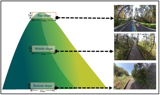 Forest trails are the primary locations for recreational experiences in urban forests. Therefore, all the sample plots were established along forest trails with a relatively uniform design and were accessible to residents for walking and sightseeing. The establishment of the sample plots should not only avoid significant differences in the surrounding environment but also avoid small spacings, as this could affect their microclimate. A distance of 50–100 m was generally maintained between the sample plots. The number of sample plots was determined via the area-based ratio method. To increase the representativeness of the sample plots, 2% of the forest area was selected for sample plot establishment. Each sample plot measured 30 m in length and 5 m in width, with an area of 150 m2, and occurred along a trail. The sample plots were analyzed via a typical sampling method. By comprehensively considering the vegetation types and slope positions encountered in urban forest communities, one sample plot was established at each slope position (top, middle, and bottom) for each of the two vegetation types (coniferous and coniferous–broadleaf mixed forests), resulting in a total of six sample plots (Figure 3).