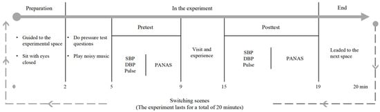 The 36 participants were randomly assigned to two groups, with each group carrying out the experiment during the brightest period of the day. To eliminate the influence of circadian rhythm variations and autumn in Chengdu, which not only features stable weather, but also marks the peak period for outdoor activities among local residents; the experiment was conducted over two consecutive days in autumn, with data collection occurring at the same time each day (9:00–12:00 and 14:00–17:00). Each day, a total of 18 participants participated in the experiment, and they were assigned to 6 groups in a random manner, with 3 individuals in each group. To eliminate order effects, each group started the experiment at a different location, with varying tour sequences. The six sample plots were analyzed simultaneously, with each experiment lasting 30 min. To minimize fatigue, each group experienced one type of vegetation across three sample plots in the morning, with a 30-minute interval between each plot visit. After the afternoon break, participants continued to experience three sample plots with a different vegetation type in the afternoon. To help volunteers relax and fully experience the environment, no more than three volunteers were allowed in each sample plot at the same time, thereby maintaining a 5 m distance between participants to minimize interference and ensure data reliability. The experimental procedure is as follows (Figure 4): (1) Preparation phase: upon arriving at the experimental site, the volunteers first closed their eyes and sat quietly for 3 min to reach a calm state. (2) Stress induction phase: the researcher played a noise recording and simultaneously began administering stress-inducing tasks (20 math problems or English word translations) to place the participants in a stress state, thus enhancing feelings of tension and pressure. In previous studies, similar scenarios have been employed effectively to induce physical and psychological stress [14,40,41,42]. After 3 min of stress induction, the pre-test phase commenced. (3) Pre-test phase: physiological data were measured and recorded, and the volunteers completed an emotion scale. During the measurement, the participants remained silent and calm. (4) Environmental perception phase: volunteers entered the environmental perception sample plot area and engaged in limited movement within the area for 6–8 min, during which they remained standing. They were instructed not to talk or use electronic devices such as smartphones, focusing solely on perceiving the environment. According to Ulrich’s stress relief theory, the restorative effects of a given restorative environment can be experienced within 5 min [14,41,43]. (5) Post-test phase: After completing the environmental perception experiment, the volunteers first completed a questionnaire, which included personal information and the positive and negative affect schedule (PANAS) emotion scale. During this period, the volunteers rested and entered a calm, relaxed state. The researchers subsequently measured and recorded physiological data again. The experimental procedures were identical for each experimental site.