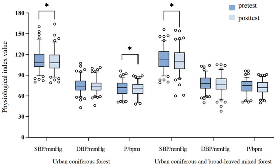 Systolic blood pressure, diastolic blood pressure, and pulse for the two vegetation types before and after experiencing the urban forests. n = 36; median ± standard deviation; * p < 0.05; verification via the Wilcoxon rank sum test.