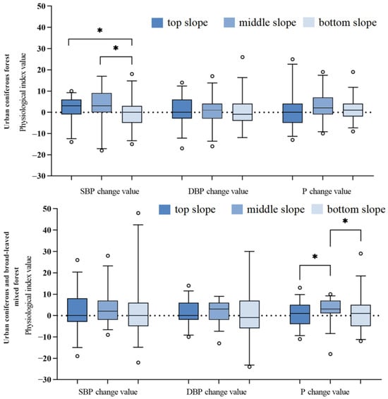 Comparison of the systolic blood pressure, diastolic blood pressure and pulse rate changes at the three slope positions in the urban coniferous and coniferous–broadleaf mixed forests. n = 36; median ± standard deviation; * p < 0.05; verified via the Kruskal–Wallis rank sum test.