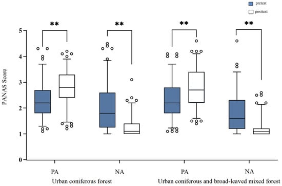 Comparison of the changes in positive and negative emotions before and after experiencing urban coniferous and urban coniferous–broadleaf mixed forests. n = 36; median ± standard deviation ** p < 0.01; verified via the Wilcoxon rank sum test.