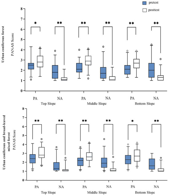 Comparison of the changes in positive and negative emotions before and after experiencing urban coniferous and coniferous–broadleaf mixed forests at the three slope positions. n = 36; median ± standard deviation * p < 0.05; ** p < 0.01; verified via the Kruskal–Wallis rank sum test.