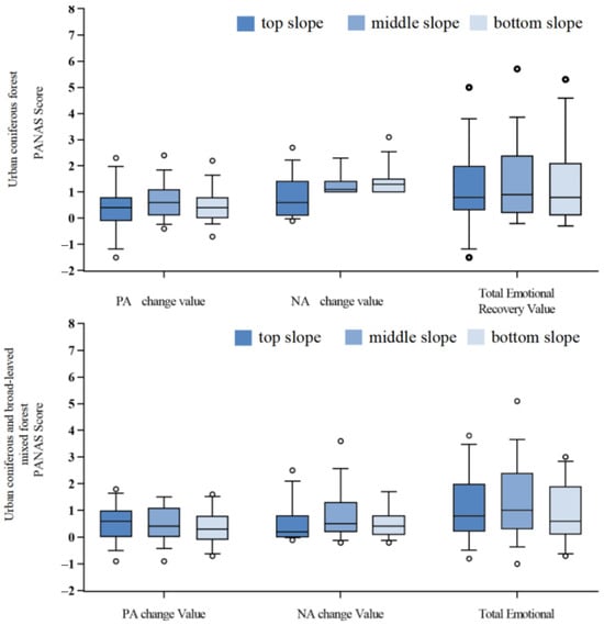 Further comparison of the changes in positive and negative emotions and total emotion changes (sum of positive and negative emotion changes) across the three slope positions in the urban coniferous and mixed coniferous–broadleaf forests, as shown in Figure 11, revealed no significant differences according to the Kruskal–Wallis rank sum test results.