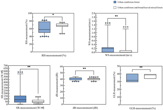As shown in Figure 12, the Mann–Whitney U test was used to compare the differences in environmental factors between urban coniferous forests and urban coniferous–broadleaf mixed forests. The results indicated significant differences in humidity (median: 58.10 and 68.50, Z = −2.093, p = 0.036), wind speed (median: 0.17 and 0.00, Z = −4.944, p < 0.001), solar radiation (median: 85.20 and 47.27, Z = −3.342, p < 0.001), sound decibels (median: 41.80 and 40.40, Z = −3.292, p < 0.001), and panoramic green view ratio (median: 0.32 and 0.39, Z = −4.233, p < 0.001) between the two forest types.