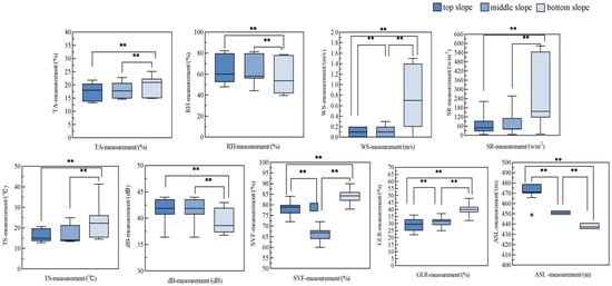 Comparison of the differences in the environmental characteristics of temperature, humidity, wind speed, solar radiation, ground temperature, sound decibels, sky visibility factor, panoramic green view rate, and altitude among the three slope positions in the urban coniferous forest. n = 36; median ± standard deviation; ** p < 0.01; verified via the Kruskal–Wallis rank sum test.