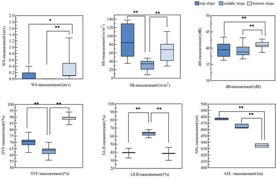 Comparison of the differences in the environmental characteristics of the wind speed, solar radiation, sound decibels, sky visibility factor, panoramic green view rate, and altitude among three slope positions in the urban coniferous–broadleaf mixed forest. n = 36; median ± standard deviation * p < 0.05; ** p < 0.01; verified via the Kruskal–Wallis rank sum test.