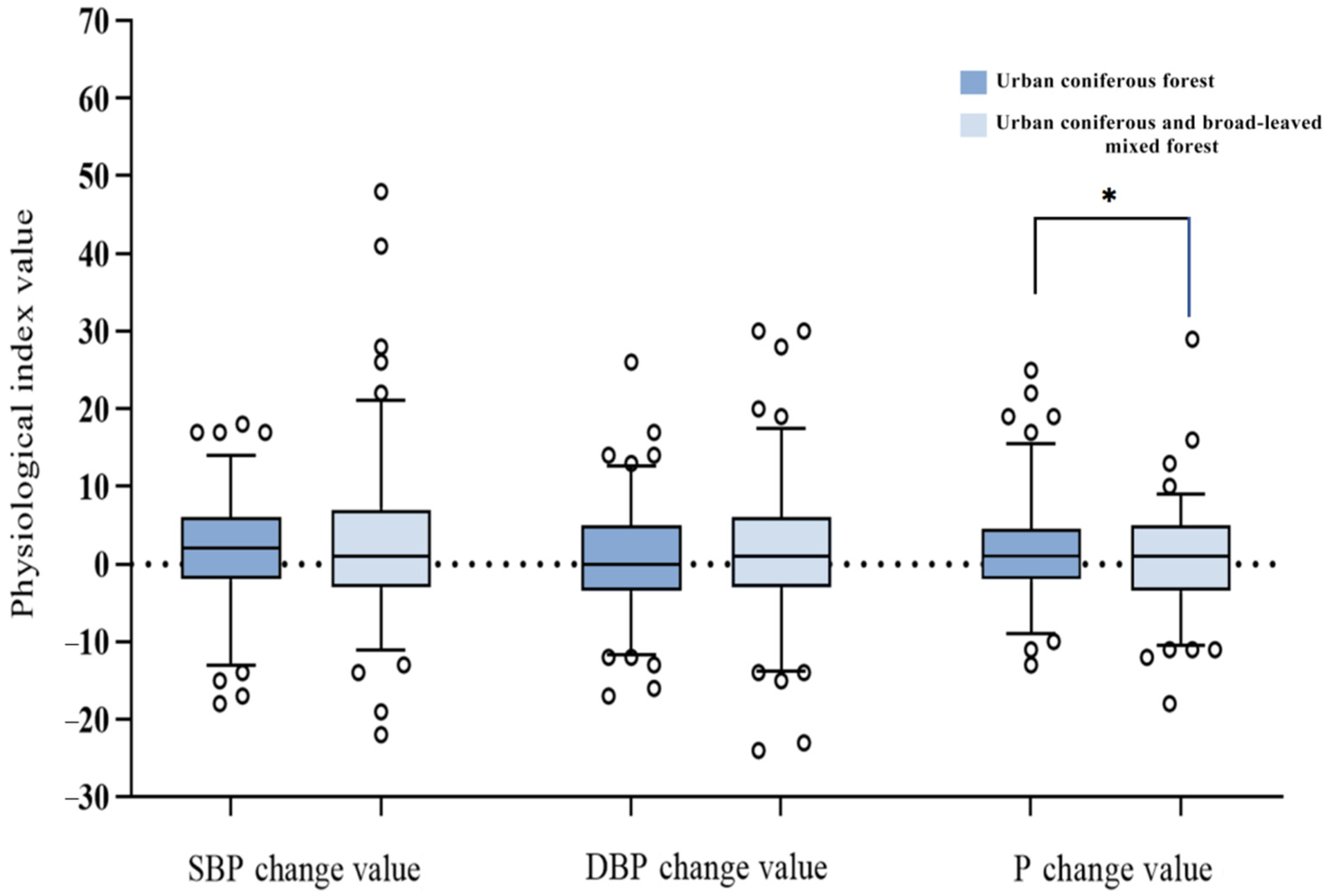 In a comparison of the changes in SBP, DBP, and pulse rate between the two urban forest vegetation types (Figure 6), the results of the Mann–Whitney U test indicated a significant difference in the variation in pulse rate (p < 0.05) after the perception experiment between the urban coniferous and coniferous–broadleaf mixed forests.