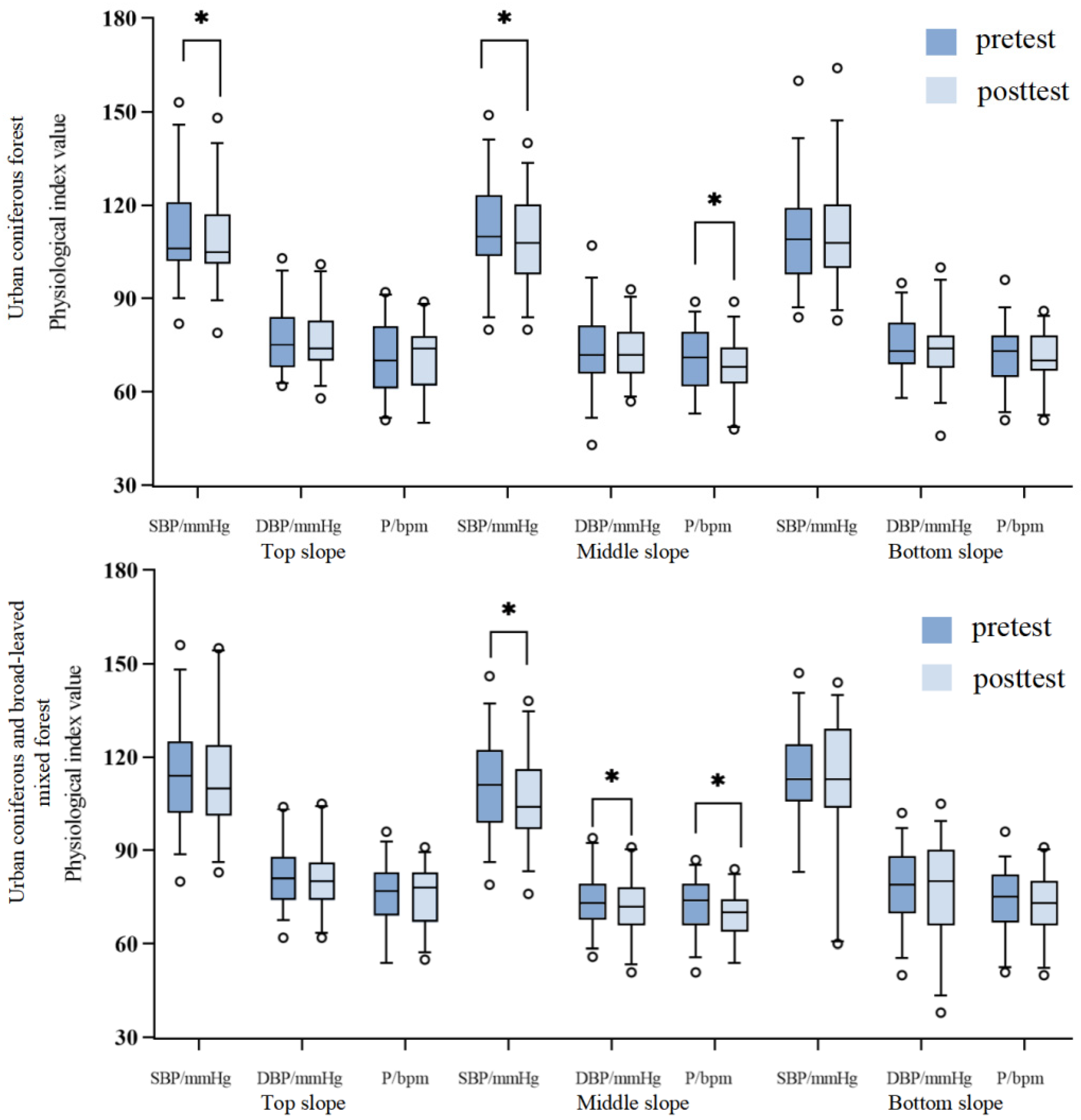 Comparison of the systolic blood pressure, diastolic blood pressure, and pulse rate changes before and after experiencing urban coniferous and coniferous–broadleaf mixed forests at the three slope positions. n = 36; median ± standard deviation; * p < 0.05; verification via the Wilcoxon rank sum test.