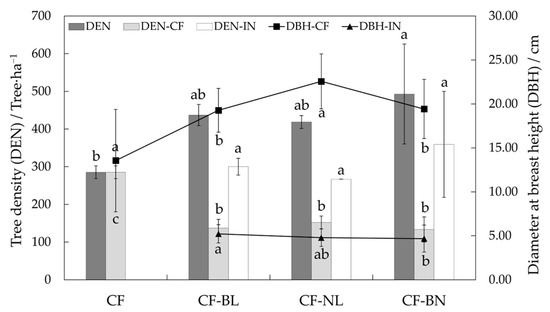 DBH and DEN in different reconstruction patterns. Note: Lowercase letters represent the significance (p < 0.05) in different patterns. The difference in DEN was marked at the top, and the difference in DBH was marked at the bottom. DEN represents tree density, DEN-CF represents the density of the Chinese fir, DEN-IN represents the density of the introduced trees, DBH-CF represents the diameter at breast height of the Chinese fir, and DBH-IN represents the diameter at breast height of the introduced trees.