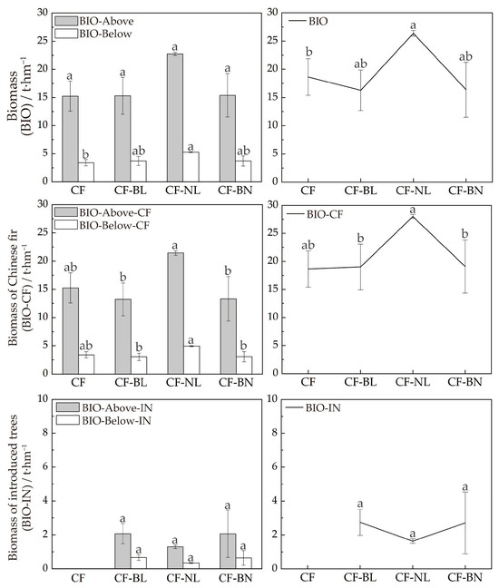 BIO in different reconstruction patterns. Note: Lowercase letters represent the significance (p < 0.05) in different patterns. BIO represents tree biomass, BIO-Above represents aboveground biomass, BIO-Below represents belowground biomass, BIO-CF represents biomass of Chinese fir, BIO-Above-CF represents aboveground biomass of Chinese fir, BIO-Below-CF represents belowground biomass of Chinese fir, BIO-IN represents biomass of introduced trees, BIO-Above-IN represents aboveground biomass of introduced trees, and BIO-Below-IN represents belowground biomass of introduced trees.