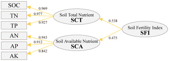 The structural equation model was constructed to calculate SFI based on soil nutrient indicators using the PLS-PM method. In this model, the observed variables SOC, TN, and TP were combined to construct the endogenous latent variable SCT, while the observed variables AN, AP, and AK were combined to construct the endogenous latent variable SCA. These two endogenous latent variables were combined to construct the exogenous latent variable SFI, representing the fertility status of the whole soil.