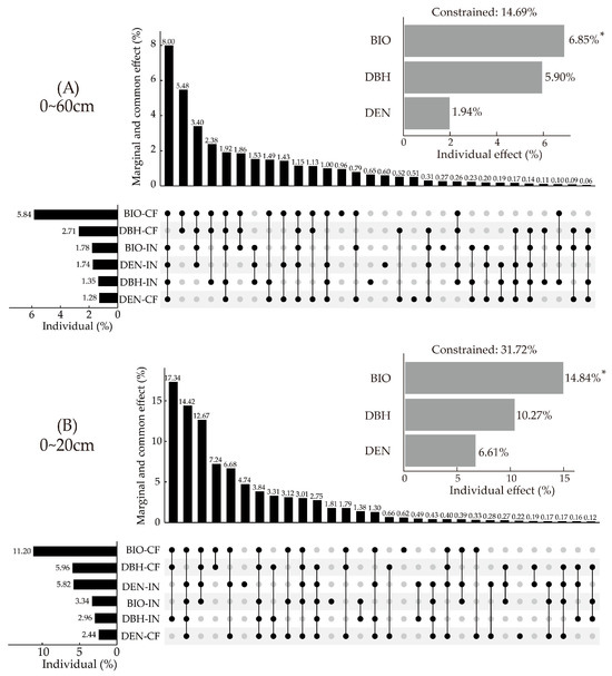 The effects of stand construction on SFI by HP of RDA. (A) HP of RDA in 0~60 cm, (B) HP of RDA in 0~20 cm. Note: * represents the p value (<0.05) of each factor. BIO represents tree biomass, BIO-CF represents the biomass of the Chinese fir, BIO-IN represents the biomass of the introduced trees, DBH represents the diameter at breast height, DBH-CF represents the diameter at breast height of the Chinese fir, DBH-IN represents the diameter at breast height of the introduced trees, DEN represents tree density, DEN-CF represents the density of the Chinese fir, and DEN-IN represents the density of the introduced trees.