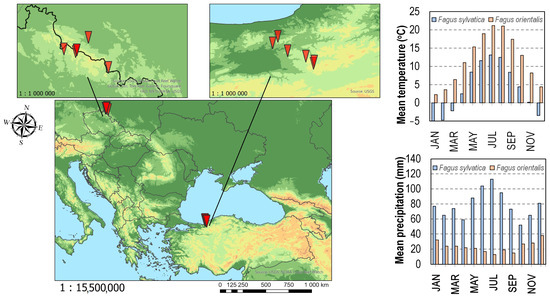 - Mellert, K.H.; Šeho, M. Suitability of Fagus orientalis Lipsky at Marginal Fagus sylvatica L. Forest Sites in Southern Germany. IForest 2022, 15, 417–423. [Google Scholar] [CrossRef]