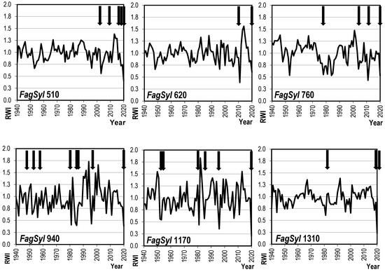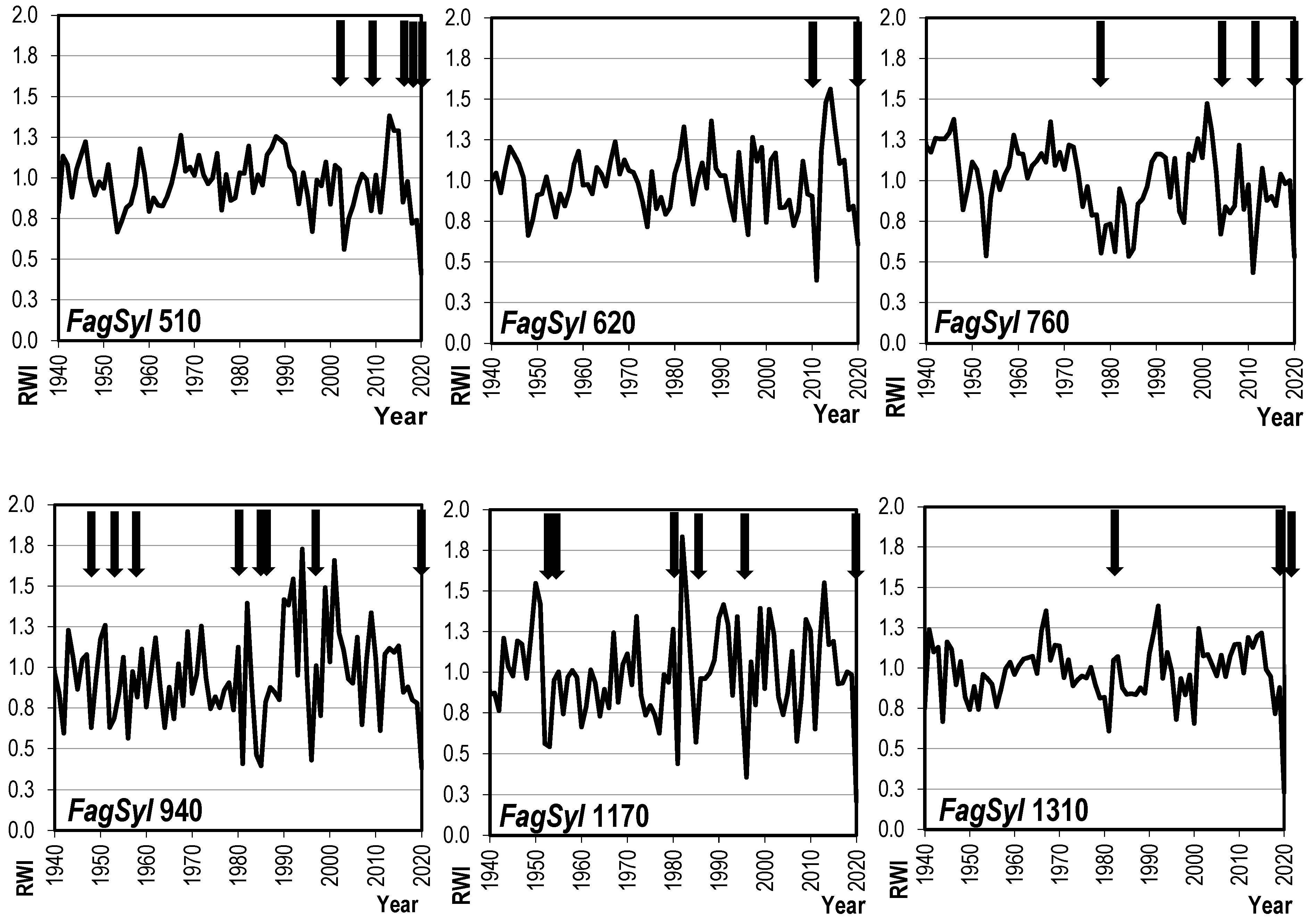 - Dittmar, C.; Zech, W.; Elling, W. Growth Variations of Common Beech (Fagus sylvatica L.) under Different Climatic and Environmental Conditions in Europe—A Dendroecological Study. Ecol. Manag. 2003, 173, 63–78. [Google Scholar] [CrossRef]