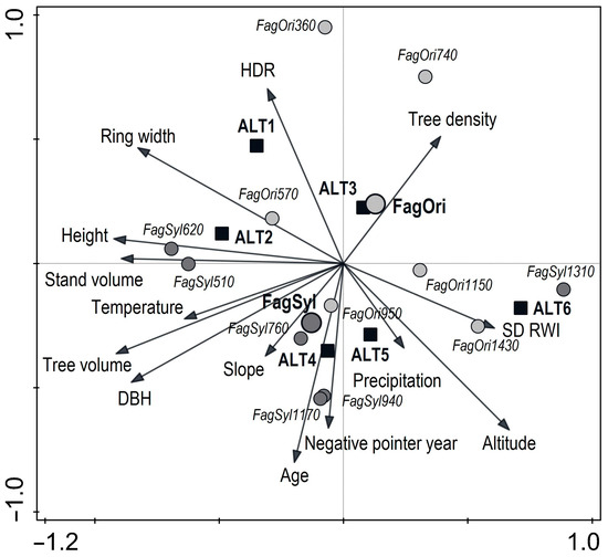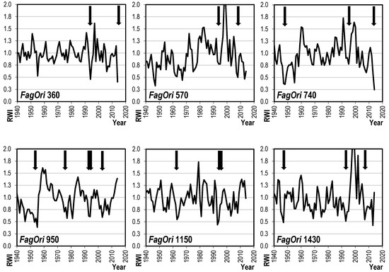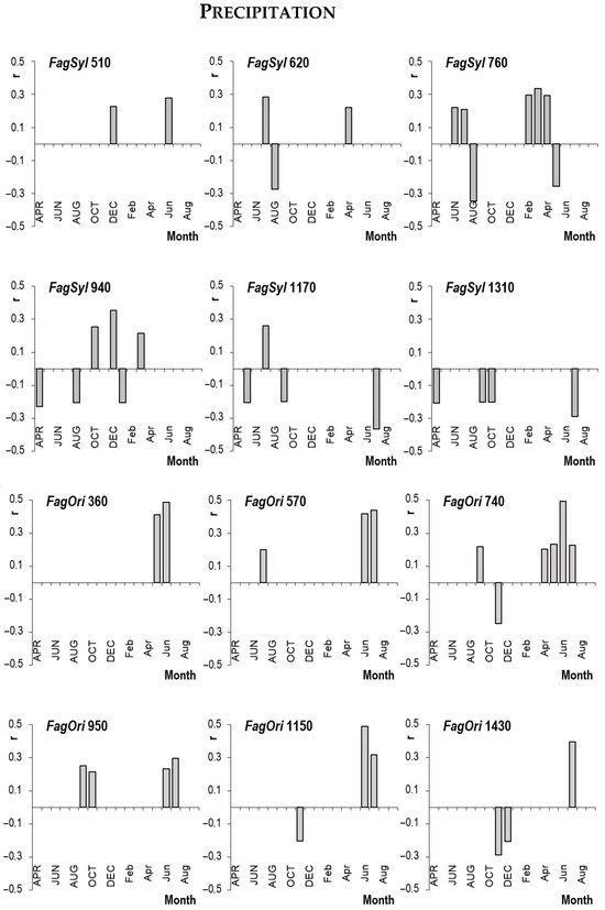 - Di Filippo, A.; Biondi, F.; Čufar, K.; De Luis, M.; Grabner, M.; Maugeri, M.; Presutti Saba, E.; Schirone, B.; Piovesan, G. Bioclimatology of Beech (Fagus sylvatica L.) in the Eastern Alps: Spatial and Altitudinal Climatic Signals Identified through a Tree-ring Network. J. Biogeogr. 2007, 34, 1873–1892. [Google Scholar] [CrossRef]