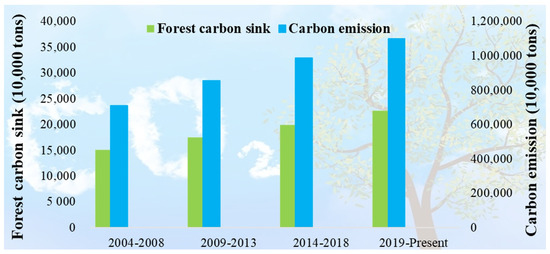 Global warming has numerous detrimental effects and is a matter of significant concern, prompting nations to adopt proactive measures to reduce carbon emissions [1]. China’s greenhouse gas emissions constitute a relatively large share of the global total. Concurrently, as a signatory to the Paris Agreement, China is committed to the timely achievement of carbon targets [2]. Forests, often referred to as the lungs of the earth, play a multifaceted role in mitigating the effects of global warming, fostering regional economic development, and improving residents’ well-being [3]. In addition, forests represent a vital resource for human development, not only in terms of their capacity to absorb carbon but also in their contribution to the economy and culture [4]. In recent years, scholars have increasingly highlighted the significant role of forests as carbon sink [5]. Forests sequester atmospheric CO2 through photosynthesis, storing carbon in plant biomass. As critical terrestrial carbon sinks, they mitigate anthropogenic emissions and regulate climate by maintaining carbon balance. Beyond carbon storage in vegetation and soil organic matter, forests stabilize ecosystems, conserve biodiversity, and protect watersheds. Their conservation and sustainable management are thus essential for climate mitigation and ecological resilience. Globally, forests represent one of the largest carbon reservoirs, accumulating carbon through tree growth and organic matter decomposition in soils and woody debris. As a responsible global actor, China is poised to assess the forest carbon sink efficiency (FCSE) and implement targeted measures to achieve the proposed policy objectives [6]. Figure 1 shows the forest carbon sink (FCS) and total carbon emission at different stages since 2004 for 30 provinces in China. The data is sourced from the China Energy Statistical Yearbook and the China Forest Resources Report.