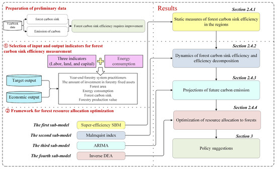 A critical natural solution to combat global warming and reduce carbon emission is the forest carbon sink (FCS). Owing to variations in geographic location, policy formulation, and economic development, Chinese provinces exhibit significant disparities in forest carbon sink efficiency (FCSE). Therefore, evaluating and enhancing FCSE and optimizing resource allocation have emerged as pressing issues. This study develops a pioneering analytical framework for the systematic estimation and optimization of FCS resources. It measures FCSE, considering both dynamic and static aspects and adopting a spatial–temporal perspective, utilizing the Malmquist Index and Super Efficiency Slacks-Based Measure to analyze the primary factors influencing FCSE. The Autoregressive Integrated Moving Average method forecasts carbon sink goals for typical regions for the years 2030, 2045, and 2060. To effectively enhance FCSE and rationally optimize FCS resource allocation, this study constructs the Inverse Data Envelopment Analysis. The study’s findings indicate significant disparities in the extremes of the average FCSE across Chinese regions, with a mean value difference of 2.2188. Technological change is the primary driver of advancements in FCSE. To achieve the 2060 carbon sink goal, each input indicator requires a substantial increase. Drawing on insights into the FCS landscape, the study delineates regional disparities and offers a scientific foundation for policymakers to devise strategies and address sustainability concerns regarding FCS.