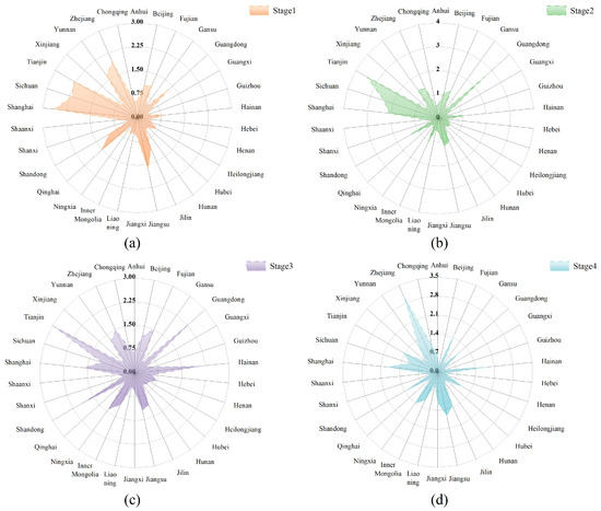 (a) Description of what is forest carbon sink efficiency of 30 provinces in China at Stage 1; (b) Description of what is forest carbon sink efficiency of 30 provinces in China at Stage 2; (c) Description of what is forest carbon sink efficiency of 30 provinces in China at Stage 3; (d) Description of what is forest carbon sink efficiency of 30 provinces in China at Stage 4.