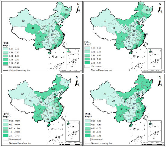 Figure 4 visualizes regional differences in FCSE. Comprehensively analyzing the distribution areas of high FCSE has the following findings. (1) The efficient regions have been expanding, mainly in the three northeastern provinces, the Hengduan Mountain Region, the Inner Mongolia Plain, the North China Plain, the southeastern coast, and some of its neighboring provinces. (2) The FCSE remains relatively consistent throughout the four stages of change, with little fluctuation in efficiency values. This is consistent with the slow growth of forests. However, there is still a small increase in FCSE in all stages, which can be generally explained by the number of nationally and regionally relevant policies that are implemented to contribute to the increase in FCS. For example, in 2009, China promulgated the National Forest Resource Management Provisions, which provided more specific regulations on forest protection and management, and FCSE in all regions showed a clear upward trajectory. It shows that the implementation of relevant policies has a guiding role in the future impact of FCS.