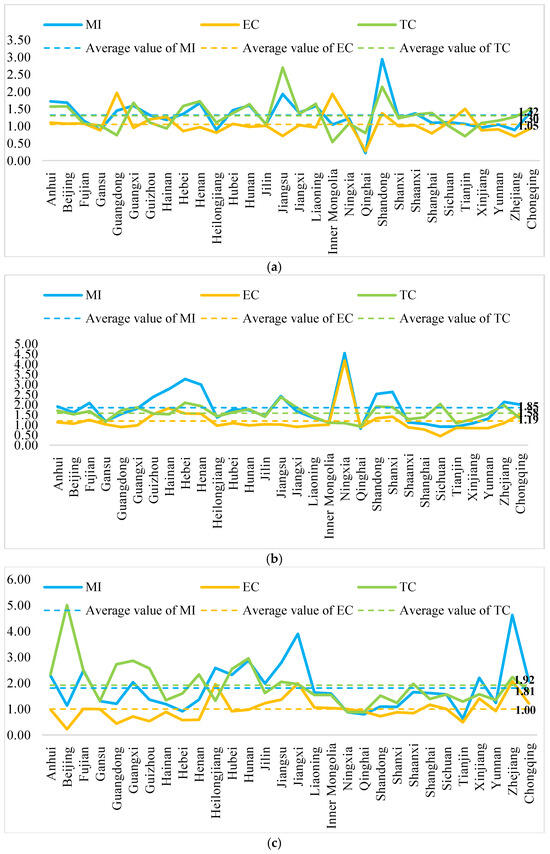 The above only measured the static FCSE; to further obtain the dynamic changes of the efficiency and analyze the main factors affecting the efficiency, MI is introduced in this study. The MI is a measure of the total factor productivity (TFP) over time [51]. MI can measure dynamically from both time and space perspectives, which has the advantage of compensating for the shortcomings of simple DEA.