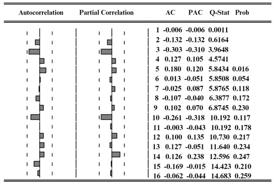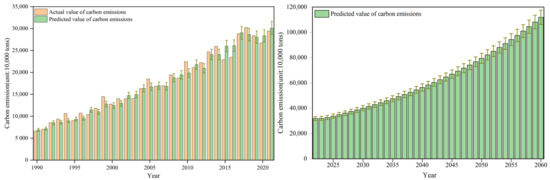 Future carbon emissions and sink in China are full of uncertainties. It is difficult to obtain data on the carbon sink target value of the forest system in the future. ARIMA is a statistical model commonly used for time series forecasting [52,53,54,55]. ARIMA models utilize historical data and random disturbance terms to construct a fitting model. They are known for their straightforward structure, ease of computation, and high degree of accuracy in fitting [53]. The AR part contains these autoregressive terms, where p represents the autoregressive order, which indicates the number of previous observations used by the model. The MA section contains these moving average terms, where denotes the moving average order, which indicates the number of past errors used by the model. An ARIMA model is developed with the following equation: