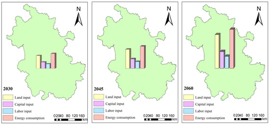 Analyzing the forest area data in Figure 8, It can be seen that, based on Stage 4, by 2030 the inputs will have to be increased by 55%. By 2060, it will have increased to four times its original level. Forest areas directly influence carbon sink capabilities, so expanding forest areas is of heightened significance in the strategy to augment FCS. It is possible to rely on measures such as returning farmland to forests to increase forest areas, but geographical constraints limit the significant expansion of forest area. In addition to forest area, the composition of labor, capital inputs, and energy consumption needs to be improved simultaneously based on the results.
