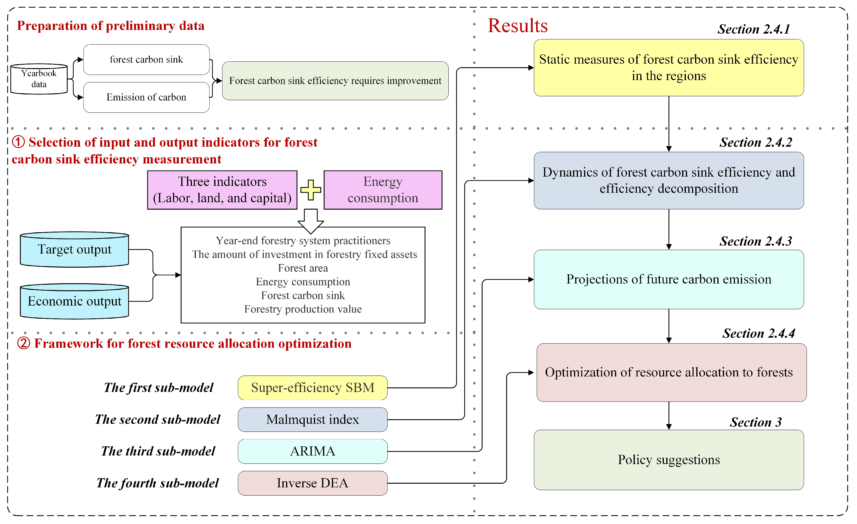 - He, X.; Chen, L.; Huang, Y. A Study of Forest Carbon Sink Increment from the Perspective of Efficiency Evaluation Based on an Inverse DEA Model. Forests 2022, 13, 1563. [Google Scholar] [CrossRef]
