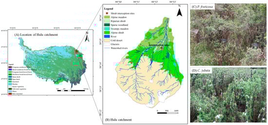 Location of the study site and shrubland sample plots. (A) Map showing the location of the Hulu catchment within the Qilian Mountains; (B) vegetation distribution within the Hulu catchment based on remote sensing imagery; (C) Potentilla fruticosa (P. fruticosa) shrubland sample plot; (D) Caragana jubata (C. jubata) shrubland sample plot.