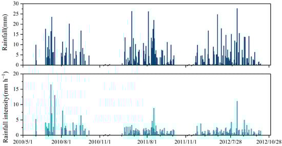 Daily rainfall (in mm) and intensity (in mm h−1) on the Hulu catchment on growing season during 2010–2012.