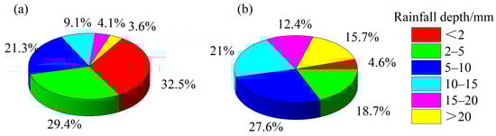Percentage distribution of rainfall events (a) and amount (b) under different rainfall class on the Hulu catchment during experimental period.