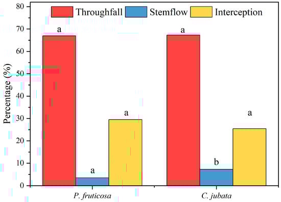 The average percentages of stemflow, throughfall, and interception loss for P. fruticosa and C. jubata, respectively. Values with different letters in the percentages of stemflow, throughfall, and interception loss between P. fruticosa and C. jubata indicate significant differences at p < 0.05.