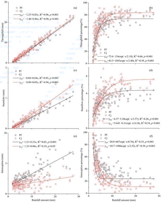 Rainfall partitioning and its relationship with rainfall amount for P. fruticosa and C. jubata. (a) Throughfall (TF), (b) Stemflow (SF), (c) Interception (IC), (d) Throughfall percentage (TF%), (e) Stemflow percentage (SF%), and (f) Interception percentage (IC%).